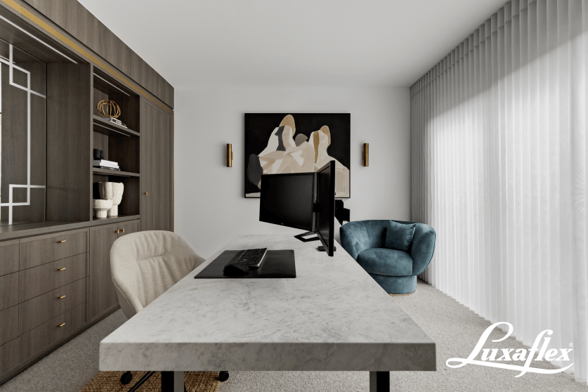 Luminette-style blinds offer a beautiful blend of elegance and functionality, featuring a soft, curtain-like appearance that enhances any interior. Their flowing fabric design and vertical vanes gently diffuse natural light, creating a warm and inviting atmosphere while adding a touch of sophistication and luxury. Perfect for large windows and sliding doors, they provide excellent light control and privacy when needed, with smooth and effortless operation for everyday convenience. Designed with a contemporary aesthetic, they complement both modern and classic interiors seamlessly. Imported from the USA, they reflect high-quality craftsmanship and premium materials, making them a refined and stylish choice for elevating your living space.